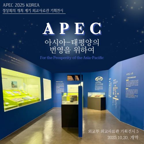 외교부는 APEC 2025 KOREA 정상회의 개최를 기념하여 2025년 10월 20일부터 APEC을 주제로 한 기획전시 ‘APEC, 아시아·태평양의 번영을 위하여’展을 서초동 외교사료관 기획전시실에서 개막합니다. 이번 기획전시는 아시아태평양경제협력체(APEC)의 출범부터 함께 해온 대한민국의 정상외교와 다자외교의 발자취를 한 자리에서 볼 수 있도록 기획되었으며, 다양한 볼거리를 위해 공개외교문서 및 2005년 APEC 정상회의 기념품 등 외교사료관 소장품도 함께 선보입니다. 이번 기획전시가 대한민국이 아시아태평양 지역과 함께 쌓아온 협력과 성과를 되새기고, 다가오는 APEC 2025 KOREA 정상회의의 성공적 개최를 위한 국민적 관심을 모으는 좋은 기회가 되기를 바랍니다. 외교사료관 APEC 특별전은 내년 상반기까지 외교사료관 기획전시실에서 무료로 관람할 수 있으며, 직접 방문관람이 어려운 국민을 위해 11월 중 외교사료관 누리집을 통해 ‘가상현실(VR) 온라인전시실’을 제공할 예정입니다. 문의: 02-3497-8786 |